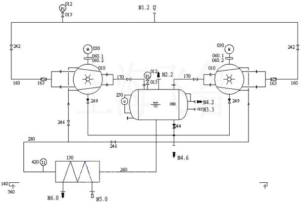 工作液用于形成真空泵的液環。工作液通過管線(260),自分離器(080)流入換熱器 (130),冷卻后通過管線(280)返回真空泵。在此過程中,壓縮產生的熱及隨被抽氣體 帶入的熱被釋放掉。該閉環機組設計為兩臺真空泵(010)共用一臺分離器(080)和一臺換熱器(130)(真空泵一開一備),一臺真空泵工作時,備用泵的吸氣管路和排氣管路上的蝶閥須關好。正常多采用一臺真空泵(010)配套一臺分離器(080)和一臺換熱器(130)。